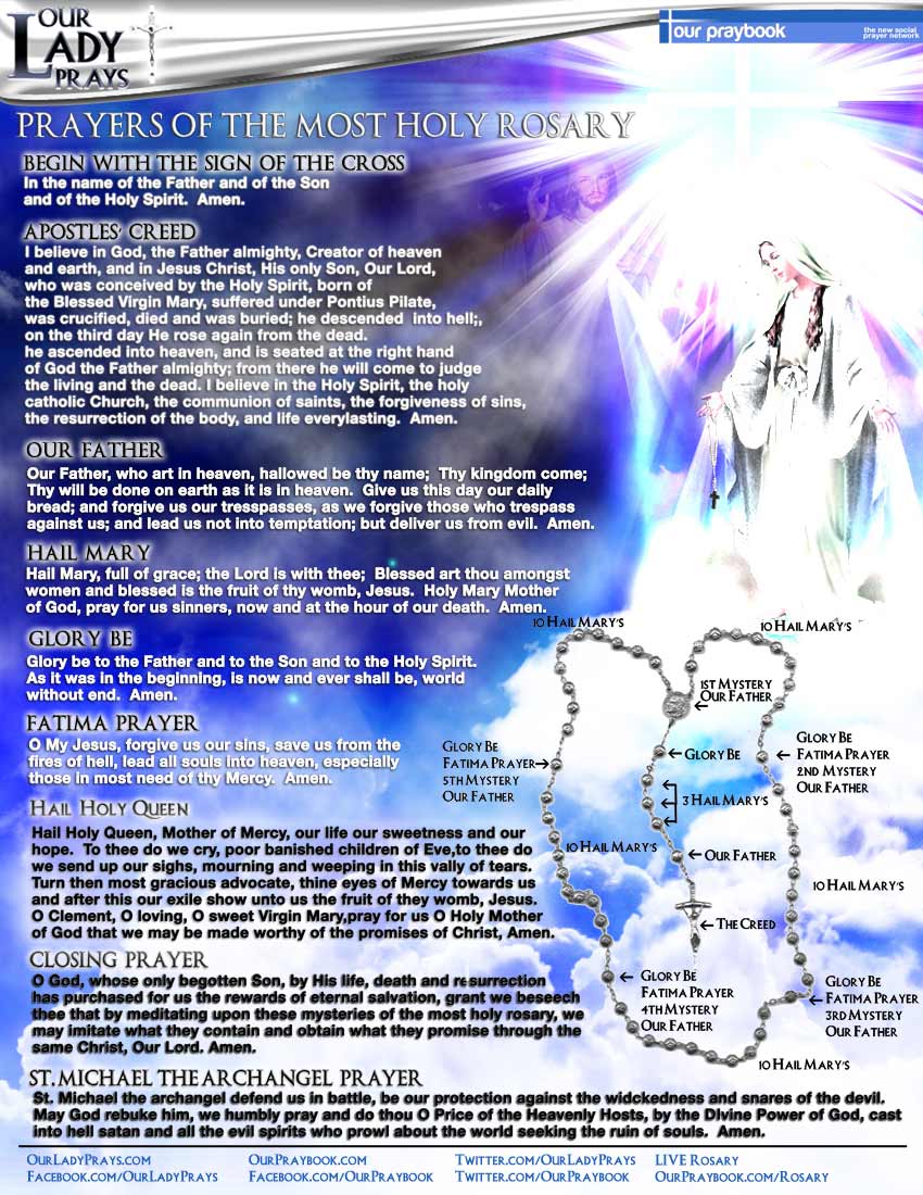 St. Michael the Archangel, defend us in battle. Be our protection against the wickedness and snares of the devil. May God rebuke him we humbly pray; and do Thou, O Prince of the Heavenly Host – by the Divine Power of God – cast into hell, satan and all the evil spirits, who prowl about the world seeking the ruin of souls. Amen.